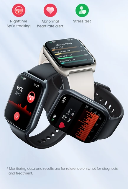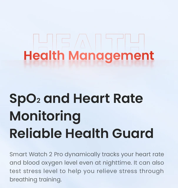 【Monitoramento de SpO2 e frequência cardíaca, proteção de saúde confiável】O Watch 2 Pro monitora dinamicamente sua frequência cardíaca e nível de oxigênio no sangue, mesmo à noite.Ele também pode testar o nível de estresse para ajudá-lo a aliviar o estresse durante o treinamento respiratório.